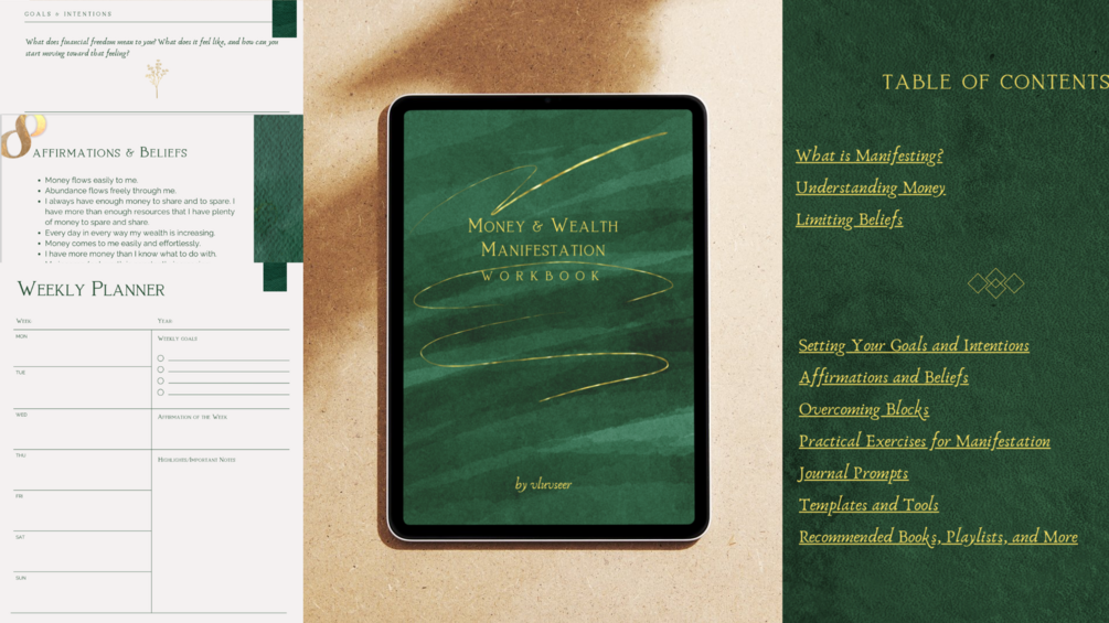 Inside this workbook, you will find an abundance of tips and resources to assist you on your wealth manifestation journey. It’ll concentrate on money, wealth, and career manifestations. Here’s what awaits you: